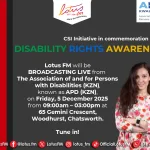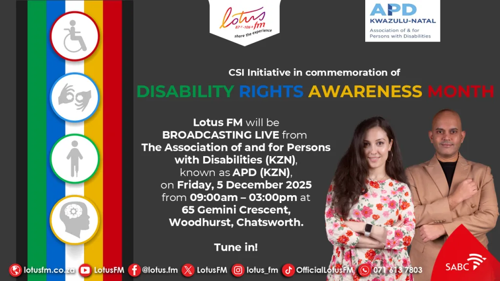 Date: December 5, 2025 Location: 65 Gemini Crescent, Woodhurst, Chatsworth Join us as we highlight the incredible work APD KZN does in empowering persons with disabilities and advocating for their rights. βΏ π Fri, 5 Dec β° 9am β 3pm π 65 Gemini Crescent, Woodhurst, Chatsworth #DisabilityRightsAwarenessMonth #LotusFM #ShareTheExperience Β