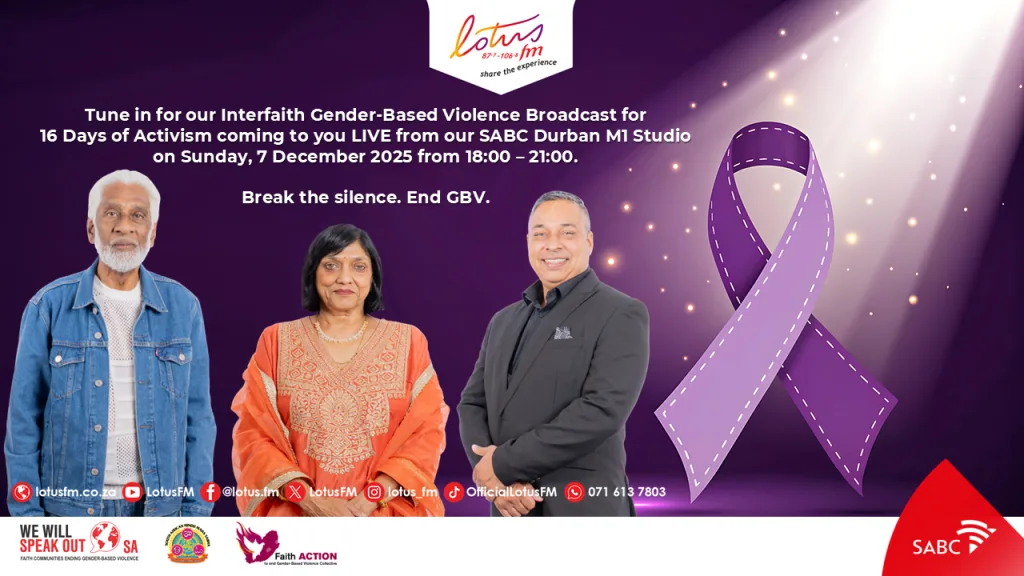 Date: December 7, 2025 Location: SABC M1 Studio, Durban Join Lotus FM this Sunday for our Interfaith Gender-Based Violence Broadcast as we stand together for the 16 Days of Activism. ππ«ππ½ π Sun, 7 Dec β° 6-9pm Letβs unite, raise our voices, & take action. Break the silence. End GBV. #16DaysOfActivism #LotusFM #ShareTheExperience Β
