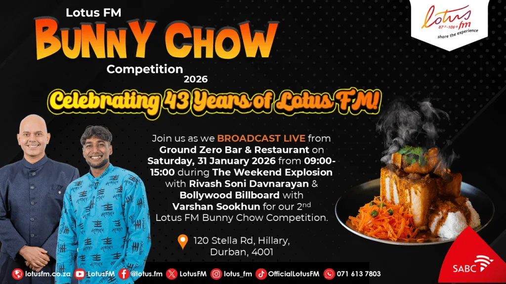 Date: January 31, 2026 Location: Ground Zero Bar & Restaurant Address: 120 Stella Road, Hillary, Durban, 4001 π₯π₯ BUNNY CHOW LOVERS, THIS ONEβS FOR YOU! π₯π₯ Lotus FM is celebrating 43 years with our 2nd Annual Bunny Chow Competition! ππ» π Ground Zero Bar & Restaurant, Hillary π Saturday, 31 January 2026 β° 9amβ3pm Catch us broadcasting live during The Weekend Explosion with Rivash Soni Davnarayan, plus Bollywood Billboard with Varshan Sookhun. […]